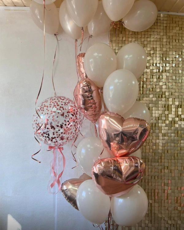 Розовое золото – это цвет, который всегда в тренде, он универсален и подходит для самых разнообразных поводов. Он гармонично сочетается с другими оттенками, такими как белый, черный, кремовый, бирюзовый или насыщенный бордовый, позволяя создавать стильные и современные цветовые решения. Эти шары добавят нотку шика на детском празднике, станут воплощением романтики на девичнике или свадебной церемонии, а также подчеркнут статусность на корпоративном мероприятии.